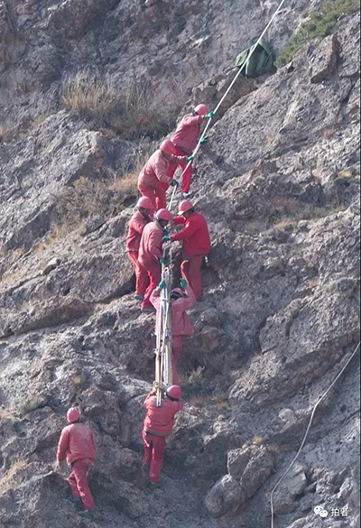 通道建成后,就成為隊員們施工的必經之路。第一道工序測量組相對容易些,第二道工序鉆井組就非常困難了。每鉆完了一口井,就需要搬家一次。鉆井組隊員們要將2個空氣壓縮機、3個發動機、1個操作臺和15跟鉆桿合計250多公斤的設備從山下運到山頂。最難的一個地方,30個人用了三四天時間,才把機器運上去。“稍有閃失,人就會從山上掉下來,非常危險。”