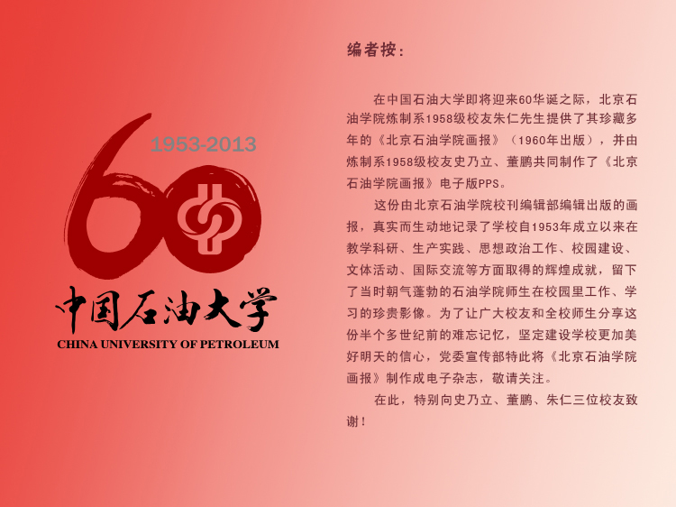 在中國(guó)石油大學(xué)即將迎來(lái)60華誕之際,北京石油學(xué)院煉制系1958級(jí)校友朱仁先生提供了其珍藏多年的《北京石油學(xué)院畫報(bào)》(1960年出版),并由煉制系1958級(jí)校友史乃立、董鵬共同制作了《北京石油學(xué)院畫報(bào)》電子版PPS。為讓廣大校友和全校師生分享這份半個(gè)多世紀(jì)前的難忘記憶,堅(jiān)定建設(shè)學(xué)校更加美好明天的信心,黨委宣傳部特此將《北京石油學(xué)院畫報(bào)》制作成電子雜志,敬請(qǐng)關(guān)注。