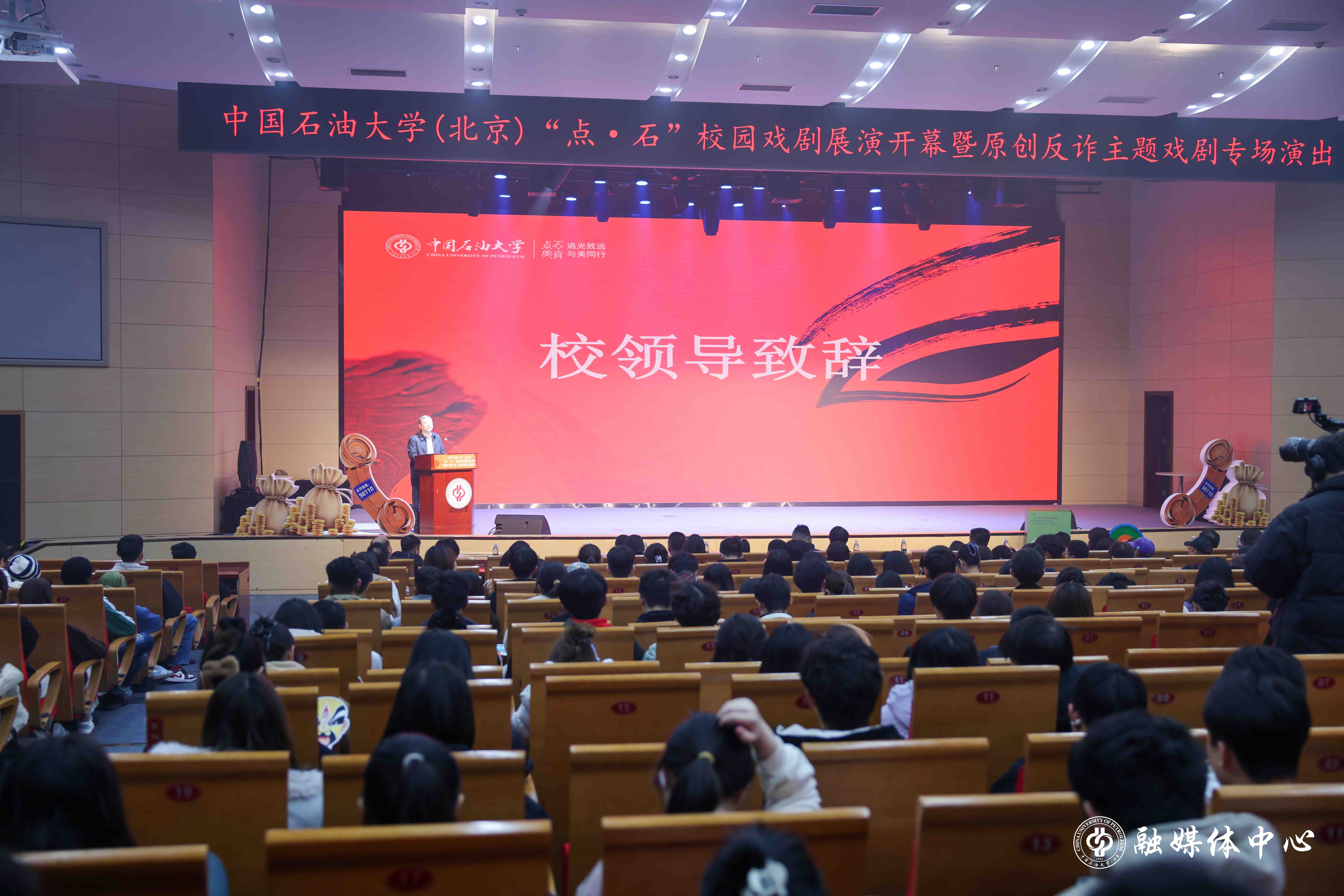 11月12日,中石大“點·石”校園戲劇展演開幕式暨原創反詐主題戲劇首演活動在中油大廈三層報告廳舉行。活動以“青春有戲,向美而行”為主題,旨在深化美育育人功能。學校副校長黃磊,北京市公安局昌平分局、昌平區反詐中心、松園派出所、昌平區文聯等單位相關負責人,以及駐昌高校代表、學校相關職能部門和學院負責人參加活動。