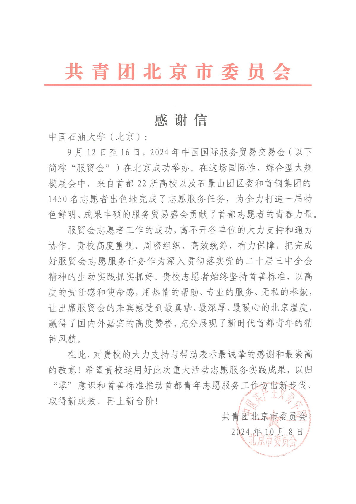 10月8日,共青團北京市委員會向中國石油大學(北京)發來感謝信,對學校在2024年中國國際服務貿易交易會志愿服務保障工作的大力支持表示感謝。
