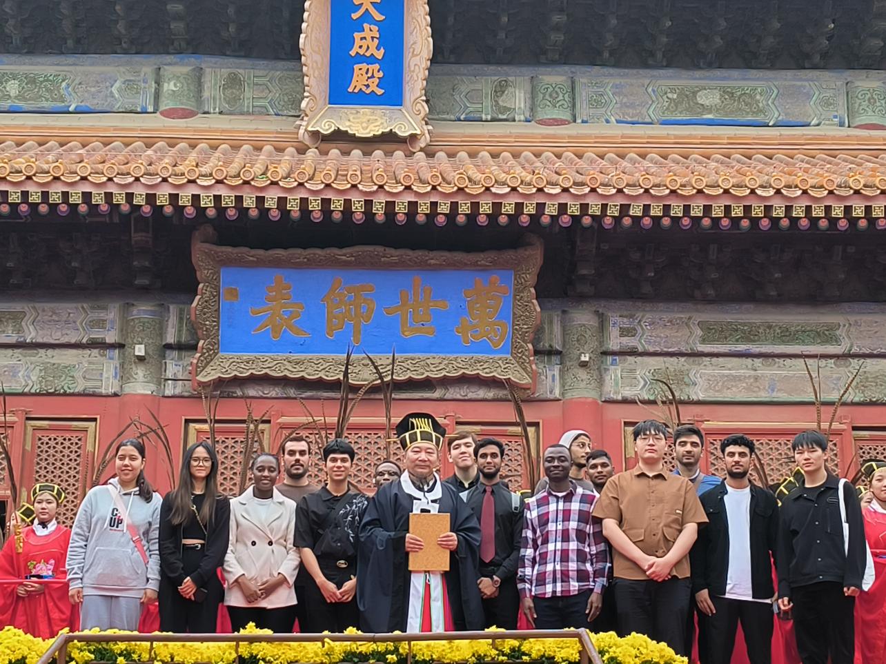 9月28日,來自土庫曼斯坦、哈薩克斯坦、孟加拉國等九個國家的來華留學生代表前往北京市孔廟和國子監博物館參加第2575屆祭孔大典,現場學習了中國傳統四拜禮,觀賞了《禮記》詩篇的吟誦和六佾舞的表演,感受到了儒家思想和中國傳統建筑、禮儀、舞蹈、詩詞文化的獨特魅力。