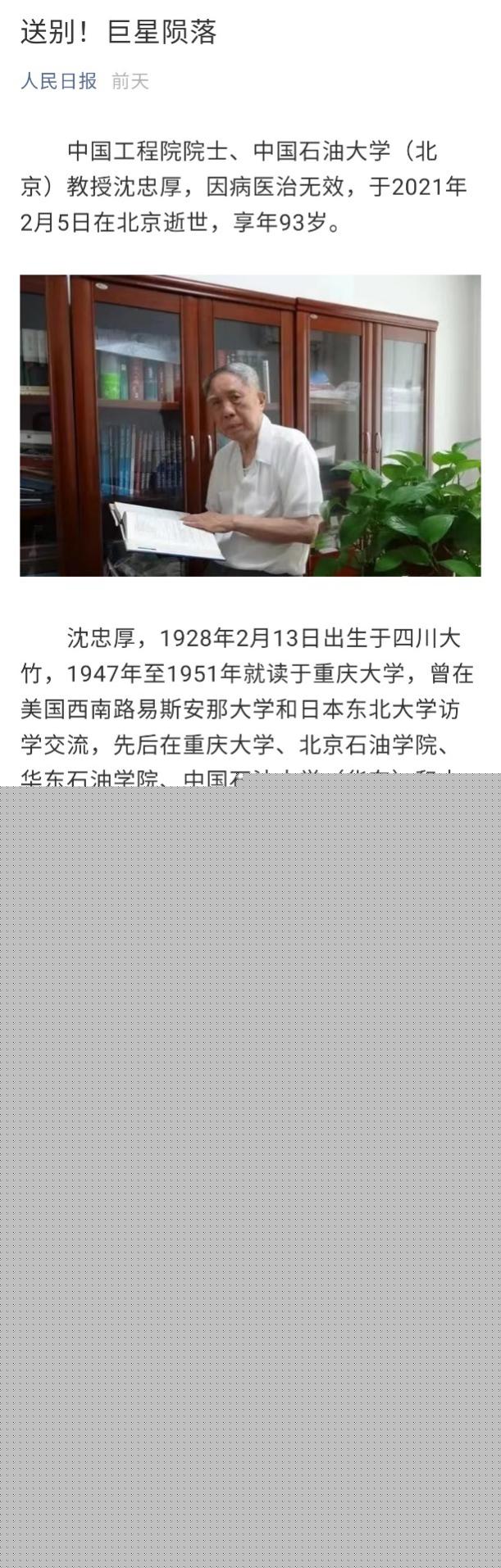 中國共產黨的優秀黨員,中國工程院院士,我國著名的油氣井工程技術專家、水射流技術專家、教育家,中國石油大學教授沈忠厚同志,因病醫治無效,于2021年2月5日11時56分在北京逝世,享年93歲。