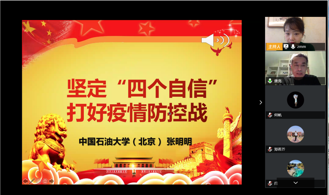 在當前疫情形勢下,為進一步增強“四個意識”,堅定“四個自信”,抓緊抓實抓細疫情防控工作,4月16日上午中石大體育與人文藝術學院直屬黨支部開展組織生活馬克思主義學院青年教師張明明應邀上了題為“堅定四個自信,打好疫情防控戰”的主題黨課