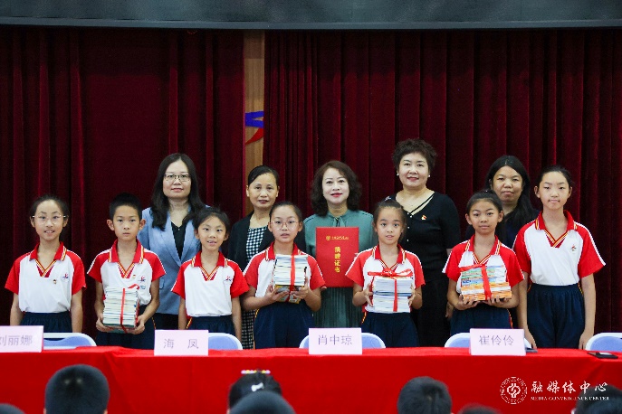 中石大工會、圖書館負責人共同為第五學校送出捐贈證書,第五學校副校長崔伶伶代表學校接受捐贈證書。