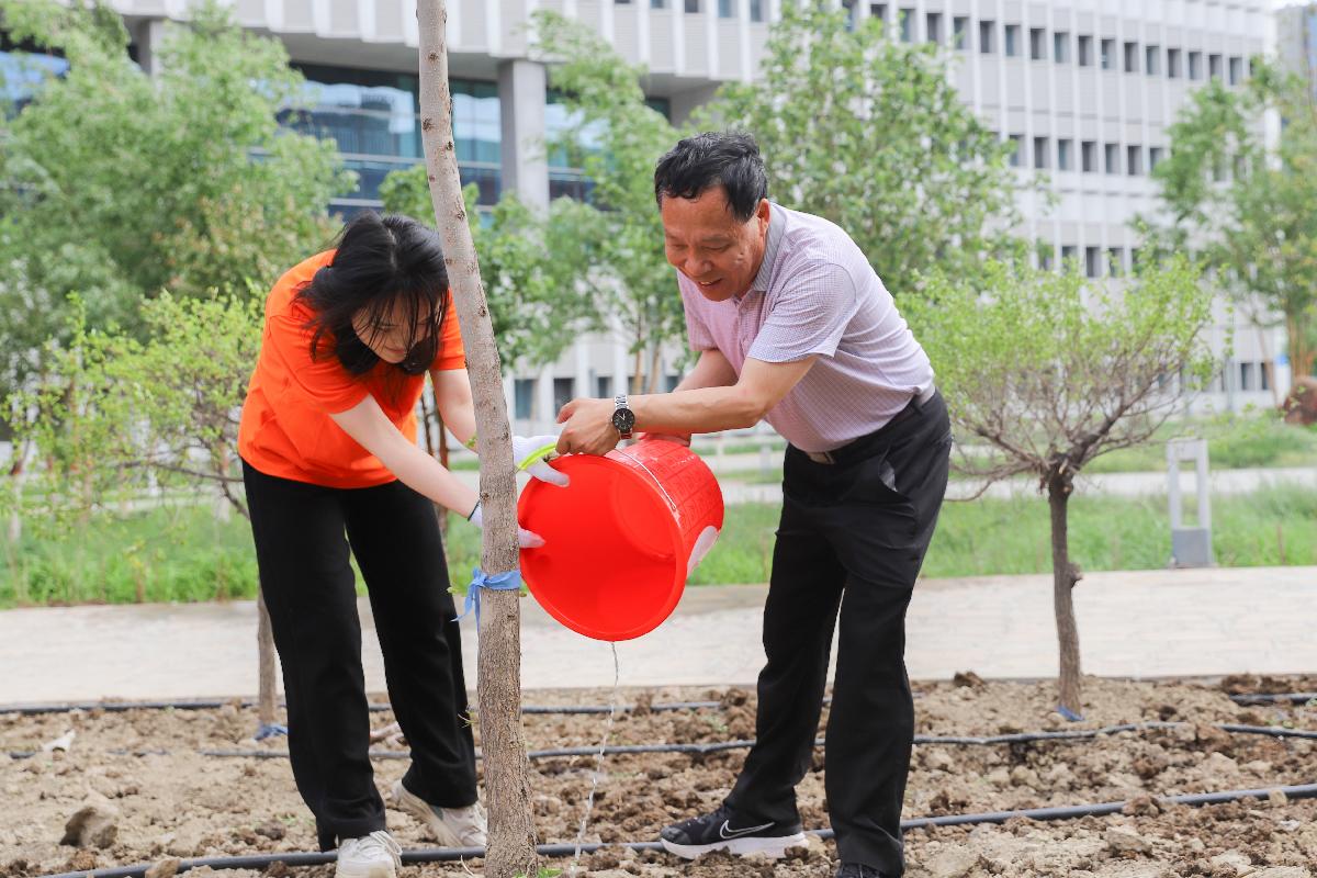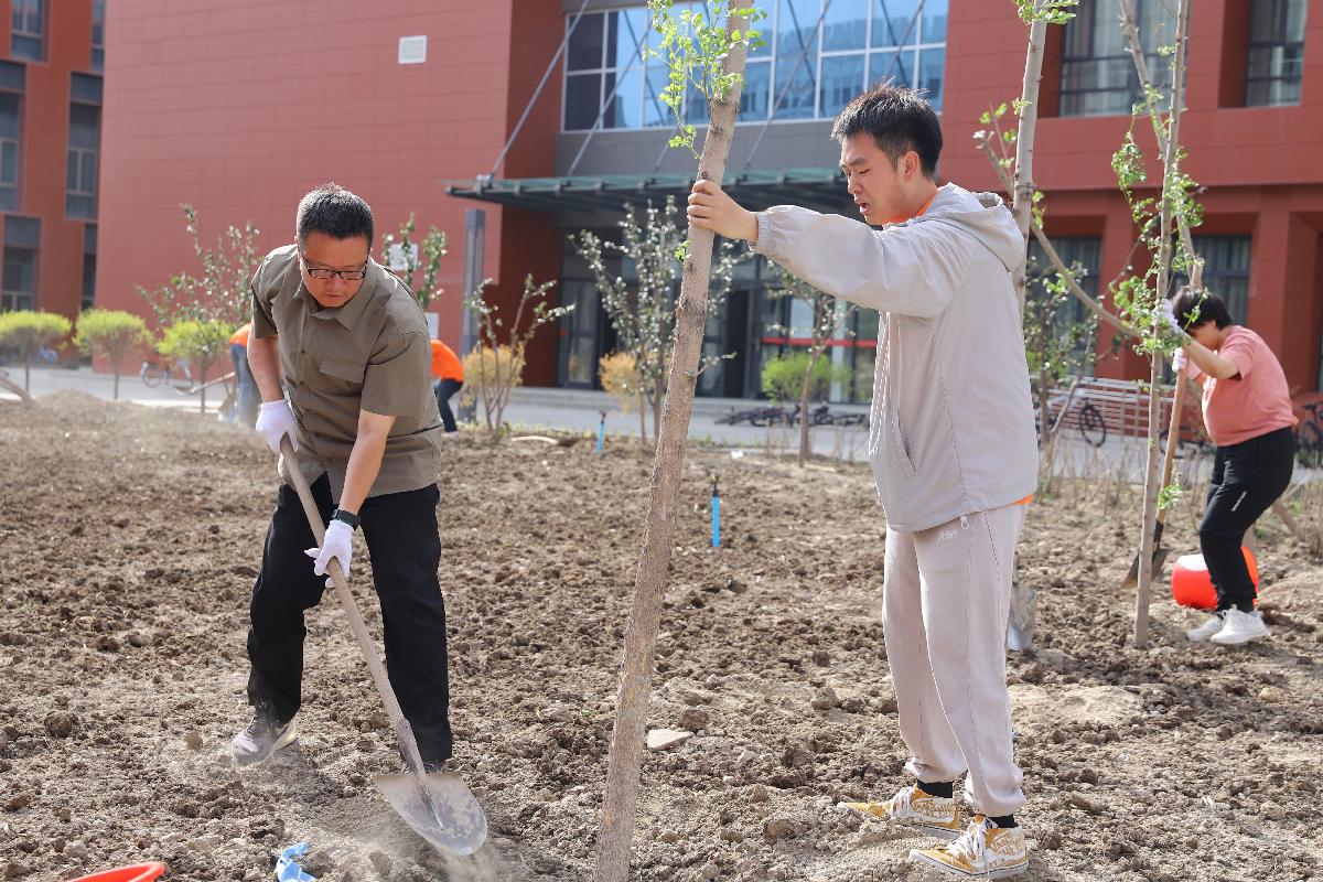 活動伊始,在工作人員的精心引導(dǎo)下,師生們兩兩結(jié)對,彼此默契配合。有的負責(zé)穩(wěn)穩(wěn)扶住樹苗,有的則專注地培土夯實;有的提起水桶,有的則小心翼翼地澆灌著每一棵樹苗。整個現(xiàn)場秩序井然,洋溢著和諧融洽的氛圍。130余棵小樹苗穩(wěn)穩(wěn)扎根在土地上,為校園增添了一抹生機勃勃的新綠。