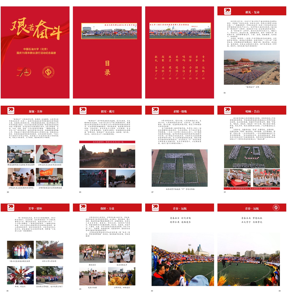 為了記錄師生們參加群眾游行活動中訓(xùn)練的精彩瞬間,展示師生們的訓(xùn)練成果,留下美好的青春記憶,學(xué)校還制作了《中國石油大學(xué)(北京)國慶70周年群眾游行紀(jì)念畫冊》,圍繞“獻(xiàn)禮·復(fù)命”“凝聚·關(guān)懷”“披星·戴月”“求精 ·熔煉”“唱響·告白”“保障·力量”“芳華·情懷”“青春·遠(yuǎn)航”等8個主題,將師生們珍貴的影像定格。
