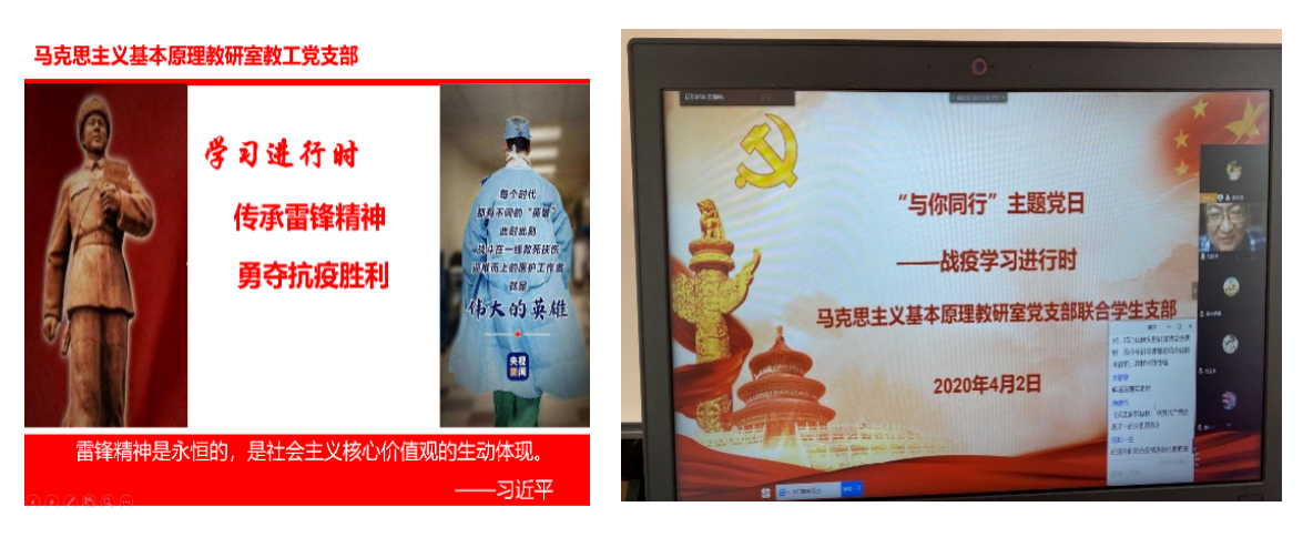 新冠肺炎疫情防控期間,中國(guó)石油大學(xué)馬克思主義學(xué)院馬克思主義原理教研室黨支部借助雨課堂、騰訊會(huì)議平臺(tái)以“萬(wàn)眾一心,共克時(shí)艱”“傳承雷鋒精神,勇奪抗疫勝利”“與你同行,戰(zhàn)疫學(xué)習(xí)進(jìn)行時(shí)”為主題開展黨日活動(dòng),組織黨員潛心學(xué),鼓勵(lì)黨員跟進(jìn)講,激發(fā)黨員躬身做。