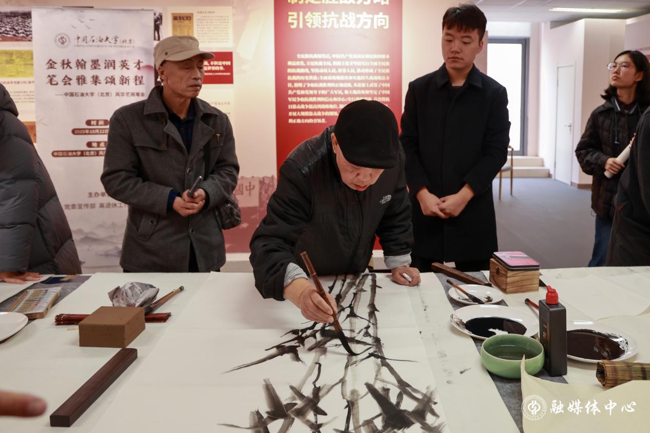 10月22日,中石大“金秋翰墨潤(rùn)英才 筆會(huì)雅集頌新程”書畫筆會(huì)活動(dòng)在主樓風(fēng)華藝苑舉行。中國(guó)美協(xié)理事、國(guó)家一級(jí)美術(shù)師、北京美協(xié)原常務(wù)副主席兼秘書長(zhǎng)賀成才,中國(guó)美術(shù)家協(xié)會(huì)會(huì)員、中國(guó)詩書畫研究會(huì)副會(huì)長(zhǎng)李如,中國(guó)書法家協(xié)會(huì)會(huì)員、原中央國(guó)家機(jī)關(guān)書法家協(xié)會(huì)常務(wù)副主席羅美富,中國(guó)書法家協(xié)會(huì)會(huì)員、河北省企業(yè)文聯(lián)書畫藝術(shù)委員會(huì)副主任任東會(huì)等書畫名家,以及學(xué)校退休教師余世誠(chéng)、劉馮瑜等應(yīng)邀與青年學(xué)子共話以文化人、以美潤(rùn)心,交流書法繪畫心得,以筆墨致敬石油精神,以色彩描繪時(shí)代新程。