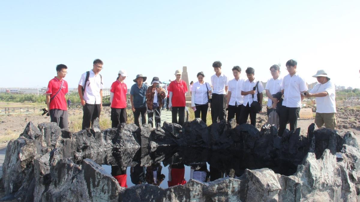 實(shí)踐團(tuán)走進(jìn)黑油山,瀝青丘旁原油自裂隙滲出后散發(fā)出濃烈的硫磺味,實(shí)踐團(tuán)得知在1955年地質(zhì)隊(duì)員正是據(jù)此油苗鎖定了克拉瑪依一號(hào)井位,山腳下還原的“地窩子”,展示出當(dāng)年工人徒步6公里取油樣的艱辛。成員還參觀了大油泡雕塑群。不銹鋼鏡面結(jié)構(gòu)反射天空景象與遠(yuǎn)處井架煉塔的輪廓,形成工業(yè)景觀的空間對(duì)話。