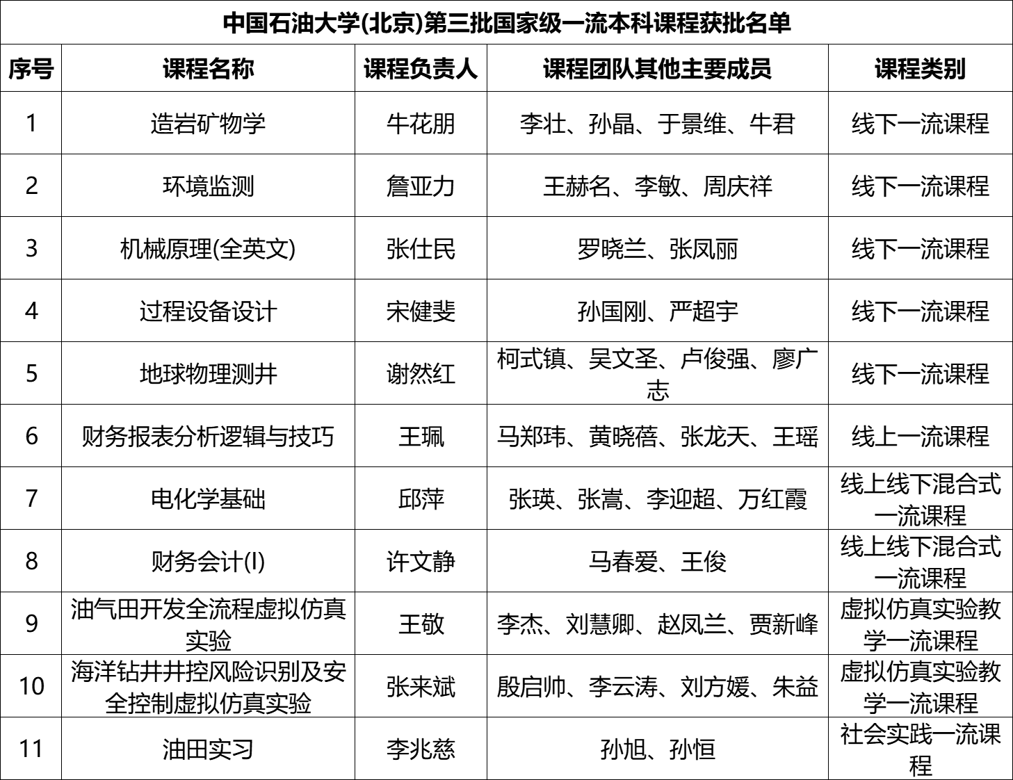 近日,教育部發布了《關于第三批國家級一流本科課程認定結果的公示》,中石大共有11門課程入選。其中線下一流課程5門、線上一流課程1門、線上線下混合式一流課程2門、虛擬仿真實驗教學一流課程2門、社會實踐一流課程1門。