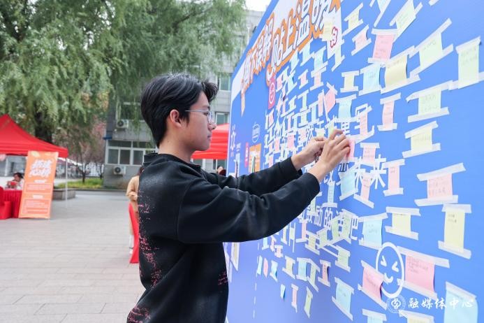 “自我探索區”內,“知心競答”環節以趣味答題的方式向同學們普及心理學知識;“撕下標簽”活動引導同學們撕掉“焦慮即軟弱”等負面刻板印象,傳遞積極寄語;“幸福長河”畫布前,同學們用畫筆勾勒生活點滴,從“食堂的一碗熱粥”到“圖書館的窗外落日”,共繪幸福畫卷。