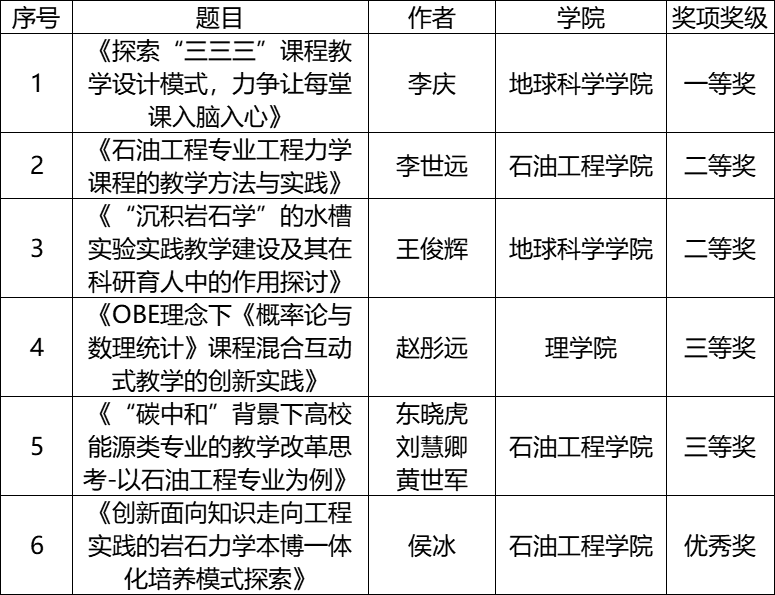青年教師教學基本功比賽是廣大青年教師糅雜理念、切磋水平、展示風采的重要載體,是助推青年教師夯實基礎、提升水平、更新理念的響亮品牌。本屆青年教師教學基本功比賽論文比賽面向全市高校青年教師征集有關教學教法的論文,共收到參賽論文405篇,經評委會評審、組委會復核,最終111篇論文獲獎。中石大22名青年教師共提交18篇論文參加比賽。