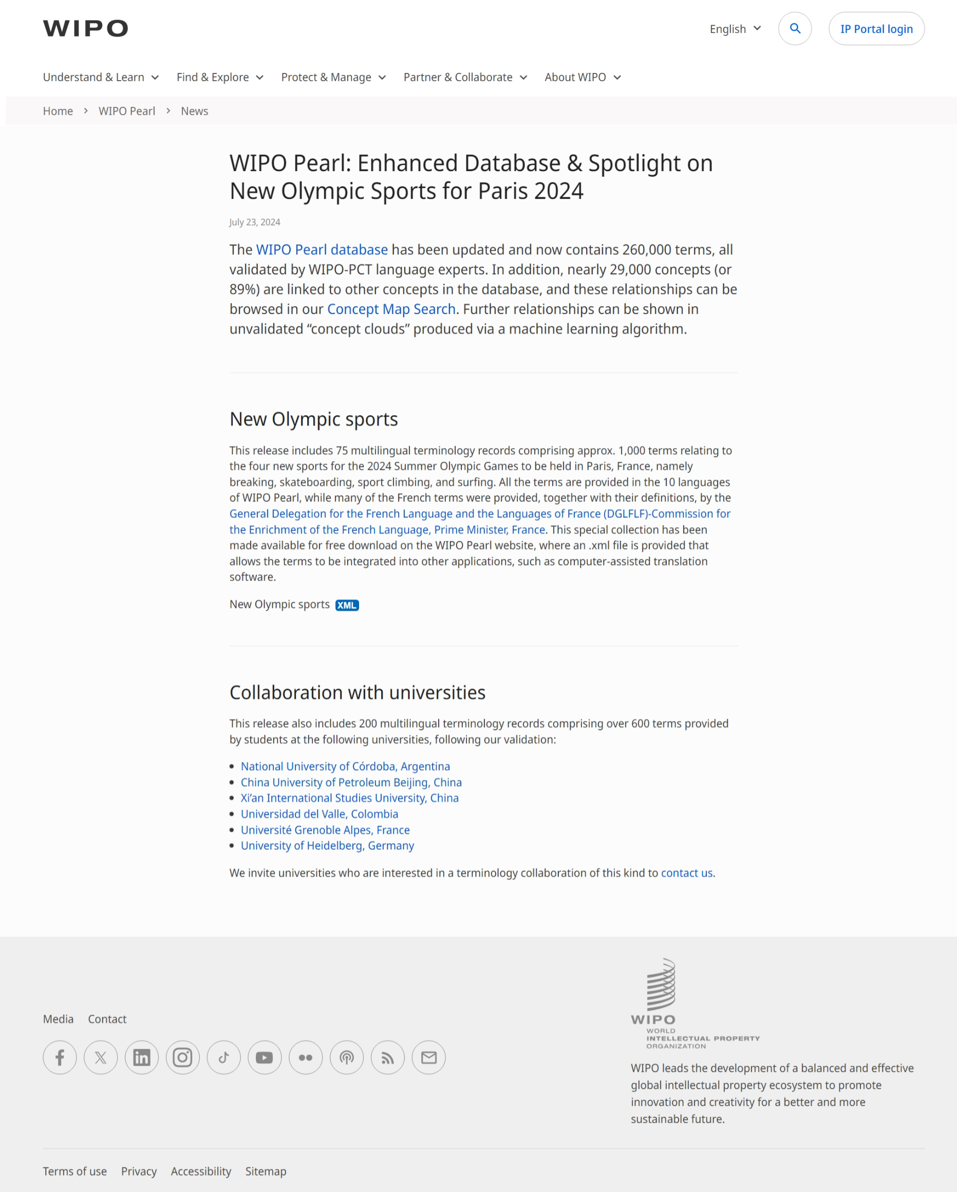 8月5日,聯合國世界知識產權組織(World Intellectual Property Organization, WIPO)公布了最新“數據庫擴充 & 聚焦2024年巴黎奧運會新項目”,包括200個由合作高校提供的多語言術語條目更新,包含超過600個術語,中國石油大學(北京)作為WIPO合作高校排名第二,在國內高校中排名第一。