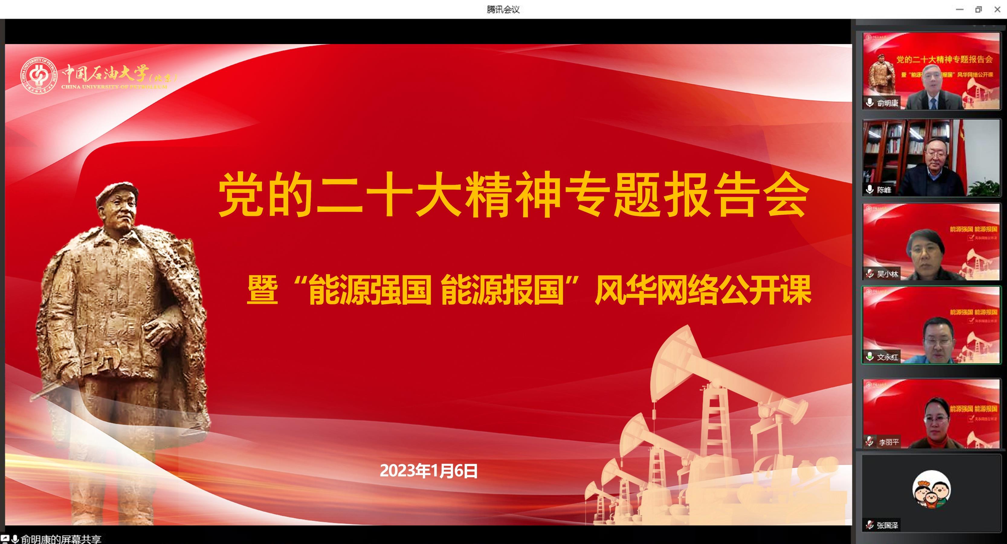 為深入學(xué)習(xí)貫徹黨的二十大精神,傳承弘揚(yáng)中國(guó)共產(chǎn)黨人精神譜系,1月6日下午,中國(guó)石油大學(xué)舉辦學(xué)習(xí)貫徹黨的二十大精神專題報(bào)告會(huì)暨“能源強(qiáng)國(guó) 能源報(bào)國(guó)”風(fēng)華網(wǎng)絡(luò)公開課,中國(guó)石化原思想政治工作部副主任俞明康受邀作了題為“石油戰(zhàn)線始終是共和國(guó)改革發(fā)展的一面旗幟,要繼續(xù)舉好這面旗幟——貫徹黨的二十大精神,弘揚(yáng)大慶精神鐵人精神”的專題報(bào)告。
