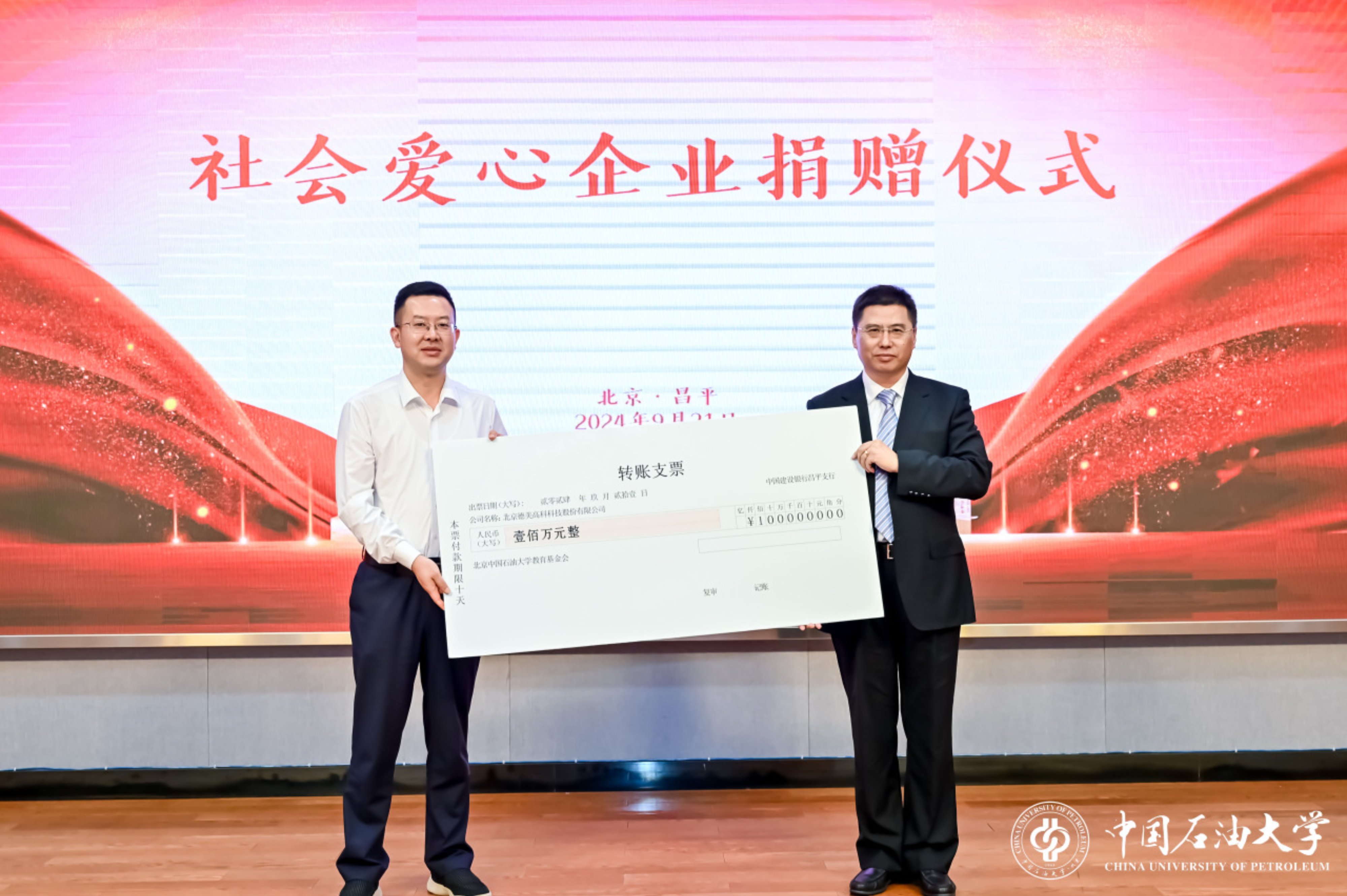 會上,北京德美高科科技股份有限公司董事長張德斌、山東祺龍海洋石油鋼管股份有限公司總經(jīng)理孟慶濱分別代表兩家愛心企業(yè),為學校捐贈100萬元、50萬元。文永紅代表北京中國石油大學教育基金會接受捐贈并頒發(fā)捐贈證書。