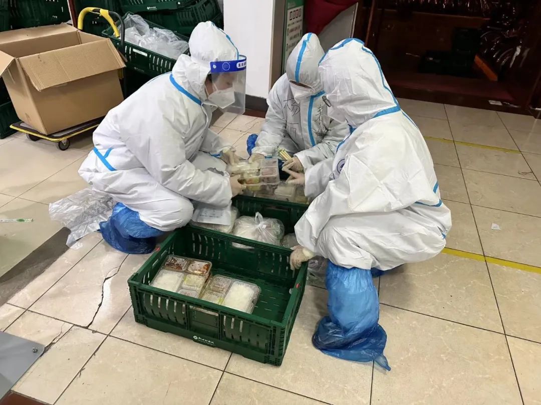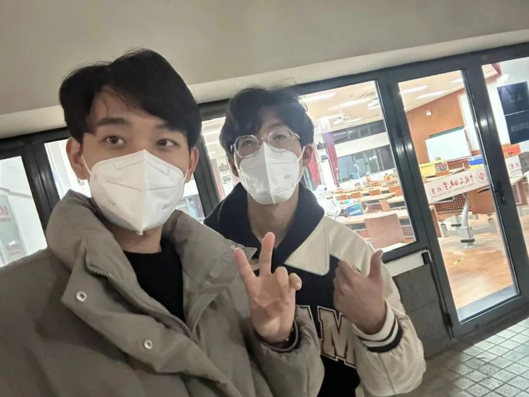 兩兄弟穿著大白,和兩位志愿者一起配送早飯、組織轉(zhuǎn)運、配送午餐、搬運物資、配送晚餐,直到最后一位同學(xué)吃上飯,倆人才顧不得形象,累得一屁股坐下。汗水氤氳模糊了面罩,一天水米未進的胃,陣陣絞痛。