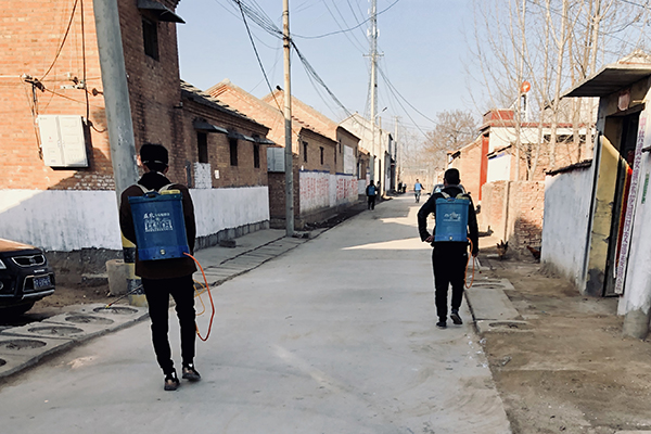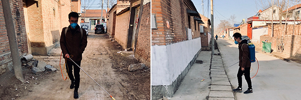 自疫情爆發以來,宋先曉主動報名參加村里的義務消毒工作。“我是黨員,我先上!”他每天早晨八點半在村里小賣部門口集合,用噴霧桶稀釋好84消毒液,然后走遍村里的大街小巷,認真地為村里道路殺菌消毒。在社區黨總支書記的支持下,宋先曉等數十名青年自發成立了“愛心袖標服務隊”,不僅挨家挨戶地上門為村民發放消毒液、宣傳防疫知識,還在村口執勤、管控人員流動,在村內巡邏消毒、勸散聚集群眾,為村里防疫工作貢獻自己的力量。