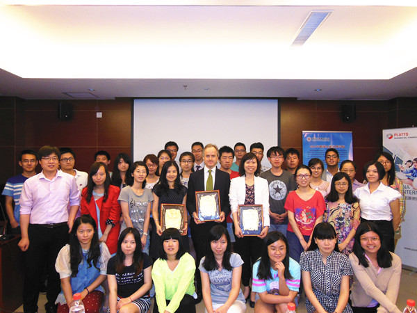 頒獎典禮宣布了李展和Steven Farfan同學入選實習生項目,并獲得在普氏能源資訊新加坡辦公室的實習機會,Sebastian Lewis和張奇為獲獎選手頒獎。Sebastian Lewis詳細介紹了普氏公司的定價機制,Oceana Zhou分析了世界油價的推手,使同學們對普氏公司的運作有了更深了解。