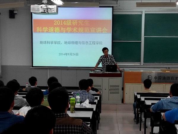 9月24日晚,石大地球科學學院與地球物理與信息工程學院在3教208教室聯合舉辦“2014級研究生科學道德與學術規范”宣講會,會議邀請了石大青年拔尖人才,具有國外求學經歷和豐富的科研成果的方琳浩、張峰、唐跟陽三位教師以及2012年“李四光優秀研究生獎”獲得者高平博士擔任主講人。