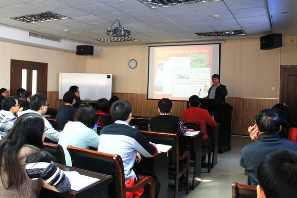 講座上,Schmitt介紹了從早期的方位井徑測量到目前流行的井中成像等地下應(yīng)力的方向及數(shù)量級估測的技術(shù),詳細(xì)闡述了估計水平主應(yīng)力方向的技術(shù)發(fā)展,講解了多種用于估算水平主應(yīng)力大小的理論及經(jīng)驗公式,以及通過從壓裂作業(yè)中獲得的壓強(qiáng)數(shù)據(jù)估算主應(yīng)力數(shù)量級的方法。報告內(nèi)容深入淺出,普及性強(qiáng)。在現(xiàn)場提問環(huán)節(jié),多位師生就報告內(nèi)容、國內(nèi)壓裂新技術(shù)的發(fā)展方向等問題與Schmitt進(jìn)行了交流討論。