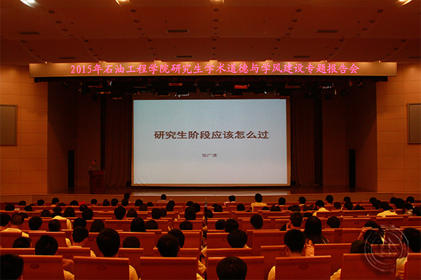 9月25日,石油工程學院在研修報告廳舉行2015年研究生學術道德與學風建設專題報告會。石油工程學院教授張廣清,青年教師李世遠、陳浩,研究生代表程萬為同學們帶來了相關方面的報告。石油工程學院全體研究生新生參加了本次專題報告會。