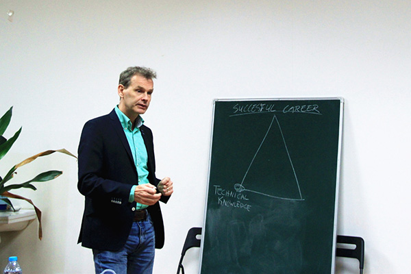 Gerard向同學們介紹了EAGE的發展歷史、學術資源和對學生分會的建設期望,并就提升個人職業競爭力等問題進行了分享交流。他通過三角示意圖說明了個人職業發展的成功不僅需要有良好的技術知識儲備,還應當培養積極向上的工作態度、增強溝通能力等軟技能。學生們紛紛表示受到了很大的啟發。