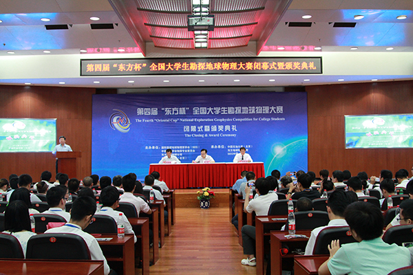 8月28日下午,第四屆“東方杯”全國大學生勘探地球物理大賽閉幕式暨頒獎典禮在石大翠宮二樓報告廳舉行。石大校長張來斌、東方地球物理公司總工程師郝會民、SEG中國執行總裁廖良基,主辦單位、承辦單位和參賽單位的領導、專家、指導教師、大賽評委以及參賽團隊參加了典禮。典禮由石大地球物理與信息工程學院院長陳小宏主持。