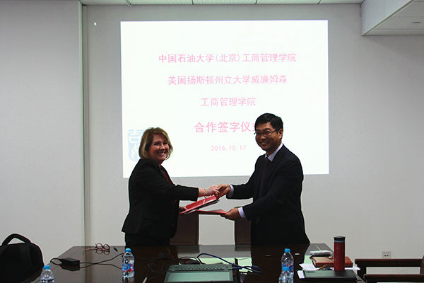 10月17日上午,石大工商管理學院與美國揚斯敦州立大學威廉姆森商務管理學院于主樓B座1115室舉行合作簽約儀式。美國揚斯敦州立大學威廉姆森商務管理學院院長Betty Jo Licata、石大工商管理學院院長郭海濤等雙方師生代表共20余人參加本次簽約儀式。