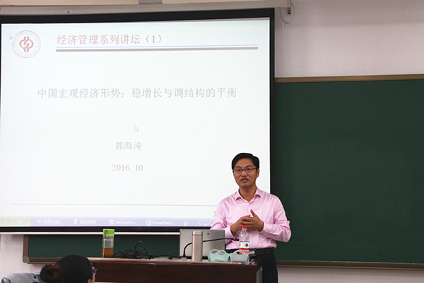 10月19日,石大工商管理學院在三教409室舉辦經濟管理系列講座。工商管理學院院長郭海濤以“中國宏觀經濟形勢:穩增長與調結構的平衡”為題作了講座,共二十余名師生參加。