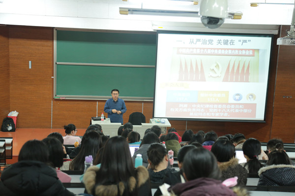 12月9日下午,石大外國語學院邀請人文學院教師張冠軍在二教101教室就十八屆六中全會精神對全體學生黨員進行了集中培訓。外國語學院全體學生黨員近90人參加培訓會。
