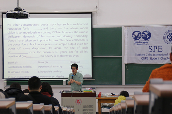 12月15日晚,石大SPE學生分會邀請微臣教育CEO陳琦和GRE項目中國區(qū)經(jīng)理高靜在三教105教室進行創(chuàng)業(yè)講座暨GRE普通考試宣講會,170余名學生參加講座。