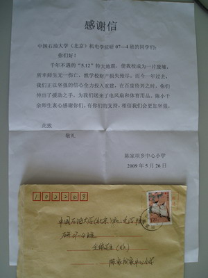 昨日,收到陳家壩中心小學的感謝信,機電研07-4黨支部的全體成員為能夠給災區的重建工作貢獻微薄之力而倍感欣喜。禮物雖小,但展示了新時代大學生的社會責任感。