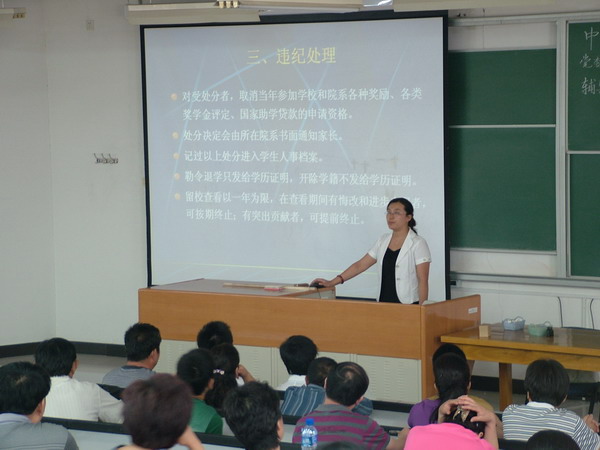 王娟首先向新生家長們介紹了各專業(yè)的輔導(dǎo)員,并強調(diào)了家長與學(xué)校溝通的重要性。隨后,王娟簡述了化工學(xué)院的概況:學(xué)院發(fā)展的歷史,各硬件設(shè)施,學(xué)科優(yōu)勢,教師和學(xué)生規(guī)模狀況,重點提出了本科教學(xué)的總體思路:厚基礎(chǔ)、寬專業(yè)、強能力;以及學(xué)院發(fā)展目標(biāo):創(chuàng)國內(nèi)一流專業(yè),培養(yǎng)具有競爭力的合格人才。之后,王娟又向新生和家長們介紹了關(guān)于學(xué)分制、助學(xué)貸款、違紀(jì)處理、免試保研及轉(zhuǎn)專業(yè)的9大方面的熱點問題。會議中,王娟反復(fù)強調(diào)了“大學(xué)并不是終點,而是一個全新的起點!”這一理念,希望各位新生抓住大學(xué)四年,充滿意義的度過自己寶貴的青春。