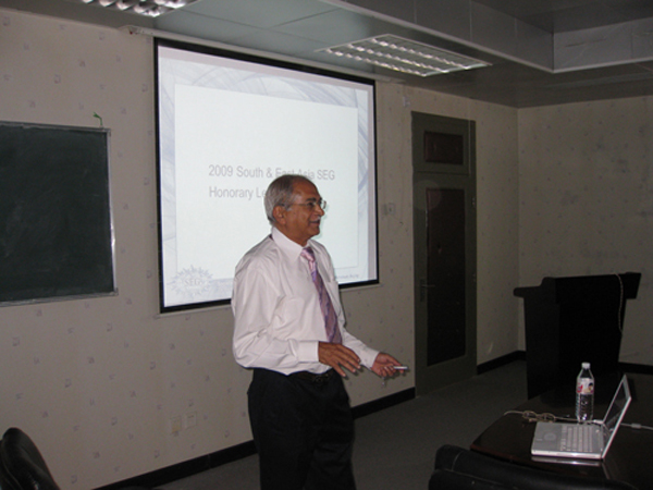 10月15日下午,2009年度美國勘探地球物理家學會(SEG)東南亞杰出巡回演講應邀在科研綜合樓1103會議室舉行,演講人為C.H.Mehta博士,演講題目為“Significance of Fresnel zones in seismic reflection prospecting”。本次報告會是巡回演講的第三站。