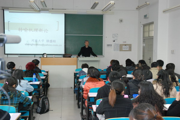 講座中,徐教授邀請同學們通過舉例引入了隱喻/轉喻學術研究的最前沿––外延內涵傳承說;接著綜述了隱喻/轉喻機理的研究成果,說明“外延內涵傳承說”的提出是轉喻機理研究的內在需要。徐教授強調外延內涵的傳承是在語言運用者的心理上、認識上實現的,并介紹了本體與喻體的外延內涵傳承的四種模式。