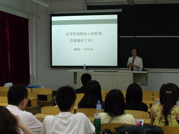 講座中,薛毅然女士以同學(xué)們對未來職業(yè)的選擇作為切入點,深入分析了學(xué)生選擇職業(yè)的不同心理以及存在的弊端,并提出了應(yīng)從分析自身特性的角度去思索和定位自己未來的職業(yè)生涯,盡早確立中長期目標(biāo),不斷積累相關(guān)經(jīng)驗,提高目標(biāo)職業(yè)所需的各項能力。她指出,第一份工作對一個人今后的發(fā)展有著十分深遠(yuǎn)的影響,同學(xué)們在確定首份工作之前,應(yīng)充分考慮好自己未來的職業(yè)發(fā)展軌跡和職業(yè)成就期望,結(jié)合個人特點與喜好,選擇一份適合自己的工作。