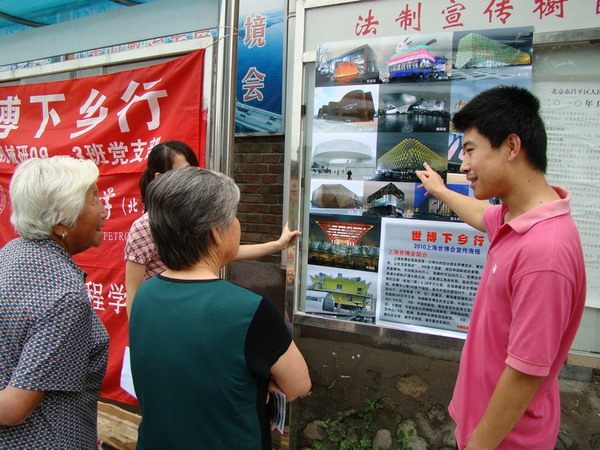 為了積極響應校團委“一校帶一鎮”活動的號召, 7月14日,石大機械與儲運工程學院攜手昌平南口鎮王莊村開展了“世博下鄉行”主題活動。本次活動通過張貼世博宣傳畫冊等方式向南口鎮王莊村村民宣傳上海世博會,使村民不出家門就能了解上海世博會知識。