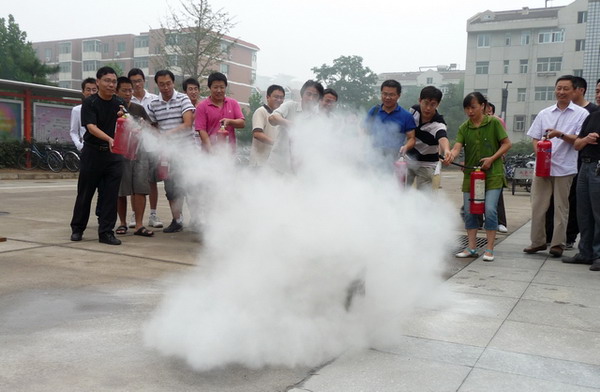 校保衛處治安科負責人為現場教職工講解了近年來學校發生的消防安全事故案例,分析了事發原因、避免方法。治安科消防安全負責人向在場受培訓人員講解并演示了滅火器的使用方法,并指導大家操作滅火器對火源進行實地滅火演練。