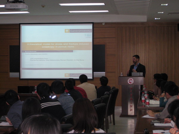 9月28日下午,理論地球物理學(xué)家、澳大利亞科廷工業(yè)大學(xué)(Curtin University of Technology)Boris Gurevich教授應(yīng)邀到中國石油大學(xué)油氣資源與探測國家重點實驗室做了題為“A theoretical model for stress and fracture induced anisotropy in porous rocks”的學(xué)術(shù)演講。Gurevich教授報告了多孔介質(zhì)中裂隙、應(yīng)力導(dǎo)致的各向異性模型理論和方法,并耐心回答了大家提出的問題。報告理論性強(qiáng),提出和發(fā)展的各向異性模型具有良好應(yīng)用前景。報告會由地球物理與信息工程學(xué)院院長肖立志教授主持。