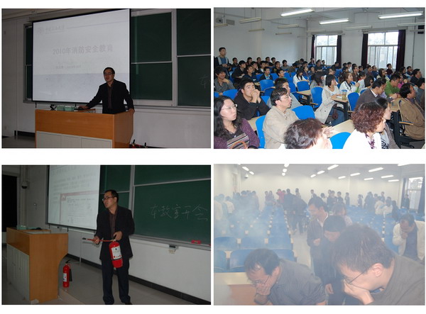 接下來,學校保衛處副處長楊恒民做了題為“2010消防安全教育”的報告,他通過觸目驚心的圖片案例使大家認識到火災的危害,并詳細講解了如何做好消防安全工作以及介紹了消防安全知識,最后現場為大家講解滅火器的使用方法以及火災逃生應該注意的事項。