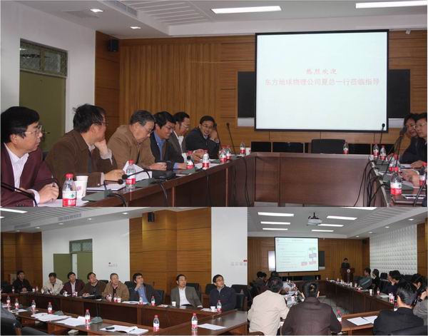 討論會上,狄幫讓教授介紹了物探重點實驗室的基本情況和自成立以來取得的研究成果。聽取完匯報后,來訪專家提出了加強東方地球物理公司與物體重點實驗室交流合作的一些具體建議,建議物探重點實驗室的研究成果能在東方地球物理公司進行測試、試用。物探重點實驗室也表達了與東方地球物理公司加強交流和合作的愿望,希望通過強強聯合的方式,實現優勢互補,為中國石油集團公司和我國的石油勘探和開發技術的發展作出貢獻。