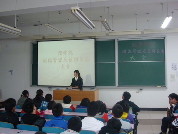 為了推廣理學院特色值周干部制度,提高學生對班級建設的積極性,理學院于10月19日晚在三教109教室召開了“班級管理及值周交流大會”。
