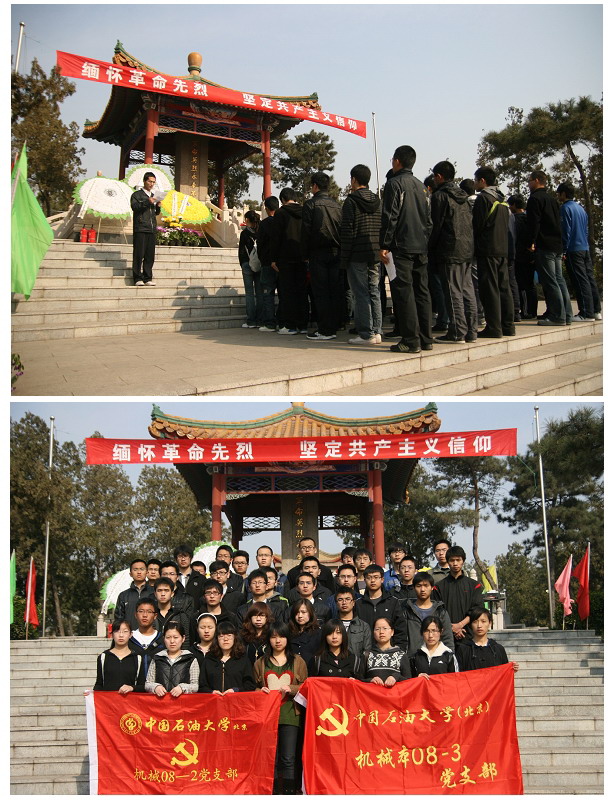 4月5日上午8時,機械學院42名黨員和部分入黨積極分子來到昌平區烈士陵園。在烈士紀念碑前,伴著莊嚴的《國際歌》,學生黨員向烈士敬獻花圈和自己親手制作的小白花,并向革命烈士默哀三分鐘,以悼念烈士們的豐功偉績。黨員代表李世堯和李楷向同學們講述了革命先烈的英雄事跡,頌揚了革命英雄的奉獻、愛國精神;黨員代表霍曉彤帶領全體黨員在烈士紀念碑前重溫了入黨宣誓儀式,號召大家繼承先烈遺志,獻身祖國石油事業,為國家建設做出自己的貢獻。