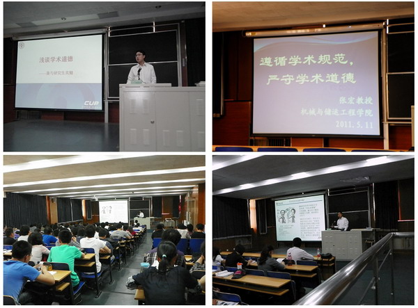 張宏老師首先從胡錦濤主席在清華大學建校100周年的講話中對全國大學生提出的三點希望講起,強調了大學生“德”的重要性。又列舉了“唐駿學歷門”、“肖氏反射弧”、“代寫論文”等近幾年來學術造假的一些案例,說明弄虛作假給學術造成的損失。又對目前在校學生在學術道德方面存在一些假、造、抄、雇、漏、霸、蒙、濫的不良現象,并結合自己多年來的科研與教學的經歷生動了講解了違反學術道德的后果和危害。張老師著重指出,研究生是精英階層,是學術界的未來,研究生的學術道德不是小問題,一定要從思想和態度上重視起來。