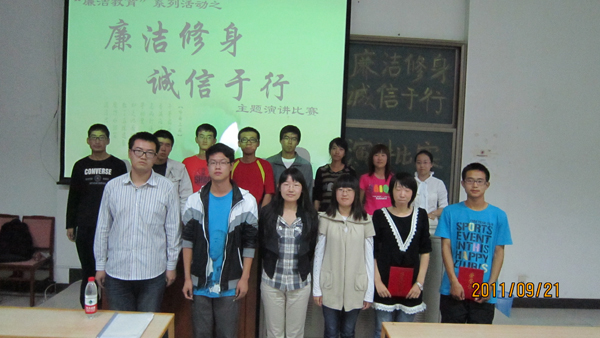 為了響應學校開展“大學生廉潔教育”主題活動的通知,引導在校大學生更好地樹立報效祖國、服務人民的信念,9月21日,理學院在新教NO.4教室舉辦了“廉潔教育”系列活動之“廉潔修身,誠信于行”主題演講比賽。