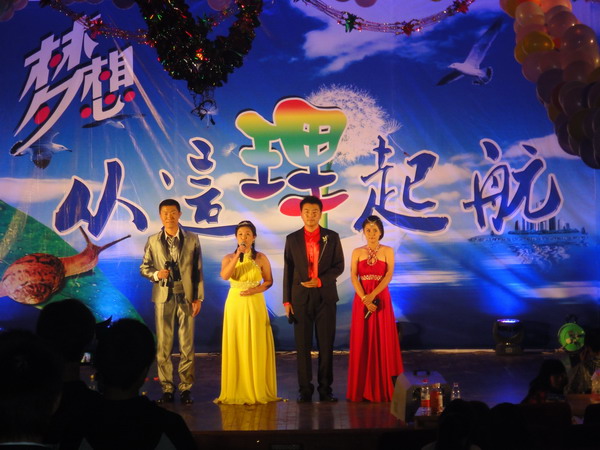晚會(huì)以一段精彩絕倫的街舞開場(chǎng)。接下來(lái),一個(gè)個(gè)別出心裁的節(jié)目使得到場(chǎng)觀眾驚喜連連。流利的英文說(shuō)唱,深情款款的德語(yǔ)歌唱,幽默別致的小品,激情四射的舞蹈等無(wú)不博得一陣陣熱烈的掌聲。理學(xué)院11級(jí)輔導(dǎo)員王祎和胡銳的特別節(jié)目更是讓晚會(huì)在感動(dòng)與幸福的氣氛中達(dá)到高潮。合唱《愛,因?yàn)樵谛闹小窞楸敬瓮頃?huì)畫上了圓滿的句點(diǎn)。