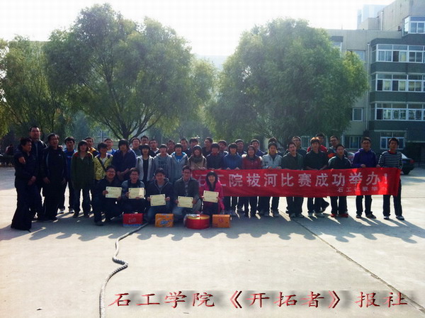 當(dāng)前位置: 首頁» 院系經(jīng)緯 石油工程學(xué)院舉行拔河比賽 發(fā)布時間:2011-10-31 | 來源:石油工程學(xué)院 | 作者:高民 | 攝影:高民 | 瀏覽量: 10月28日,石工學(xué)院拔河比賽決賽在北校區(qū)南廣場舉行。參加本次拔河比賽的有石工學(xué)院學(xué)生會、研究生會、社團聯(lián)合會、開拓者報社以及青年志愿者協(xié)會,經(jīng)過三天的激烈角逐,石工學(xué)院學(xué)生會摘得冠軍。 分享到: 排行榜 薦讀 中石大召開2024年全面從嚴治黨工作部署會暨... 對口支援中國石油大學(xué)(北京)克拉瑪依校區(qū)工作... 中石大獲評 “昌平區(qū)學(xué)習(xí)型示范高?!?/h3> 中國石油大學(xué)2022年十大新聞揭曉 新年賀詞 | 雄關(guān)漫道 惟有登攀
