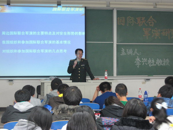 講座中,李教授從不同方面向同學們介紹了國際聯合軍演的意義、特點,及其對安全形式的影響,總結了我國組織和參加軍演的基本情況,還就組織和參加軍演的若干問題與同學們展開熱烈的討論,并對當前兩岸關系以及如何以正確的心態做出了正確的解釋。