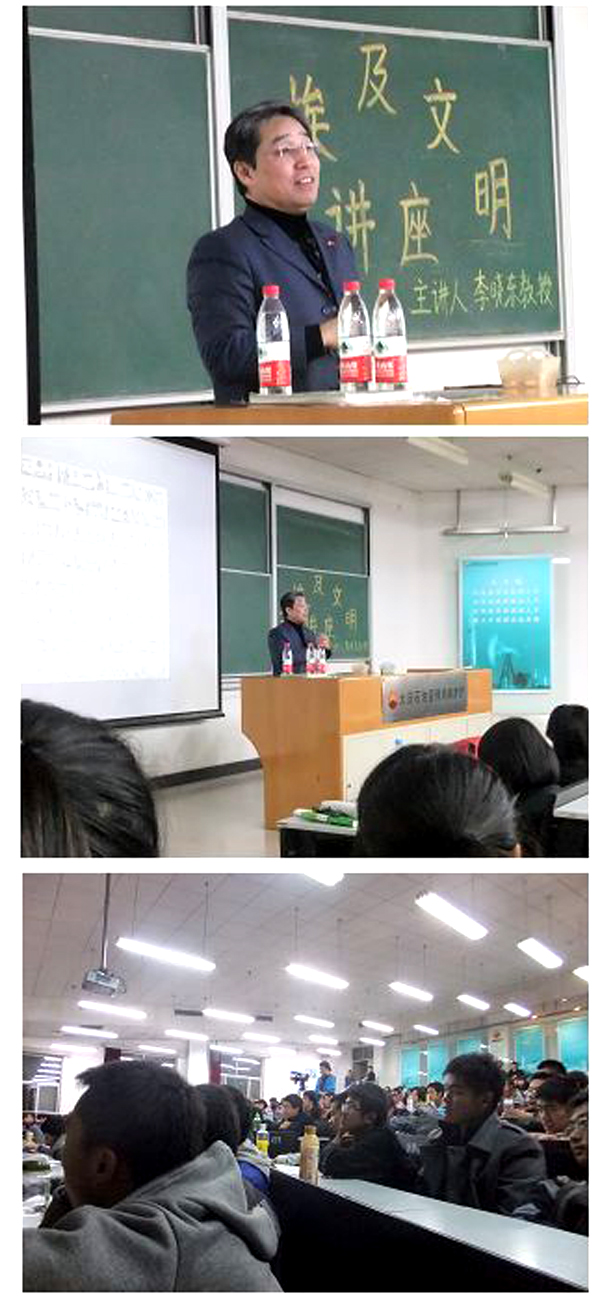 當前位置: 首頁» 院系經緯 石大地學院邀請李曉東教授講授古埃及文明 發布時間:2011-11-16 | 來源:地球科學學院 | 作者:續一簡、趙文 | 瀏覽量: 11月9日晚,地學院社聯在三教106主辦了古埃及文明主題講座,講座由東北師范大學世界古典文明研究所教授、著名埃及學研究專家李曉東教授主講。 講座中,李曉東教授從象形文字開始,講述內容涵蓋古埃及神話故事,木乃伊的由來,埃及政黨的力量,以及法老的詛咒等。講座最后,同學們踴躍提問。整個講座在輕松愉快的氛圍中進行,在同學們熱烈的掌聲中結束。 分享到: 排行榜 薦讀 中石大召開2024年全面從嚴治黨工作部署會暨... 對口支援中國石油大學(北京)克拉瑪依校區工作... 中石大獲評 “昌平區學習型示范高校” 中國石油大學2022年十大新聞揭曉 新年賀詞 | 雄關漫道 惟有登攀
