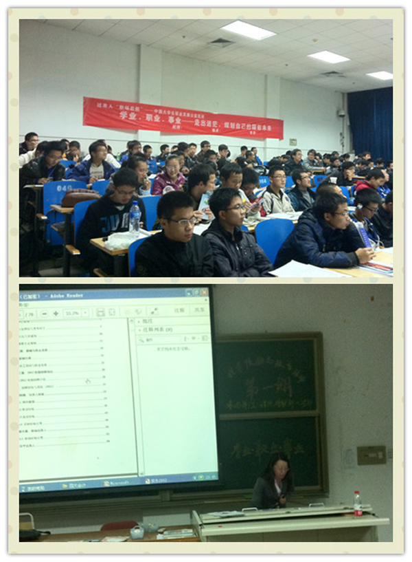 活動由理學院學生會外聯部和心理部承辦,邀請“過來人”就業指導機構的著名講師蔣玲老師開展講座。蔣玲圍繞“學業、職業、事業”展開話題,著重為同學們講授了大學生活規劃、寫自評和簡歷的技巧、求職技巧等幾個方面。她說明了當前世界500強企業及其他大公司對大學生的要求,提出“20%興趣+100%能力+1%機遇”是個人事業發展的必然要求,同時也讓大家明確了做實習工作的重要性。